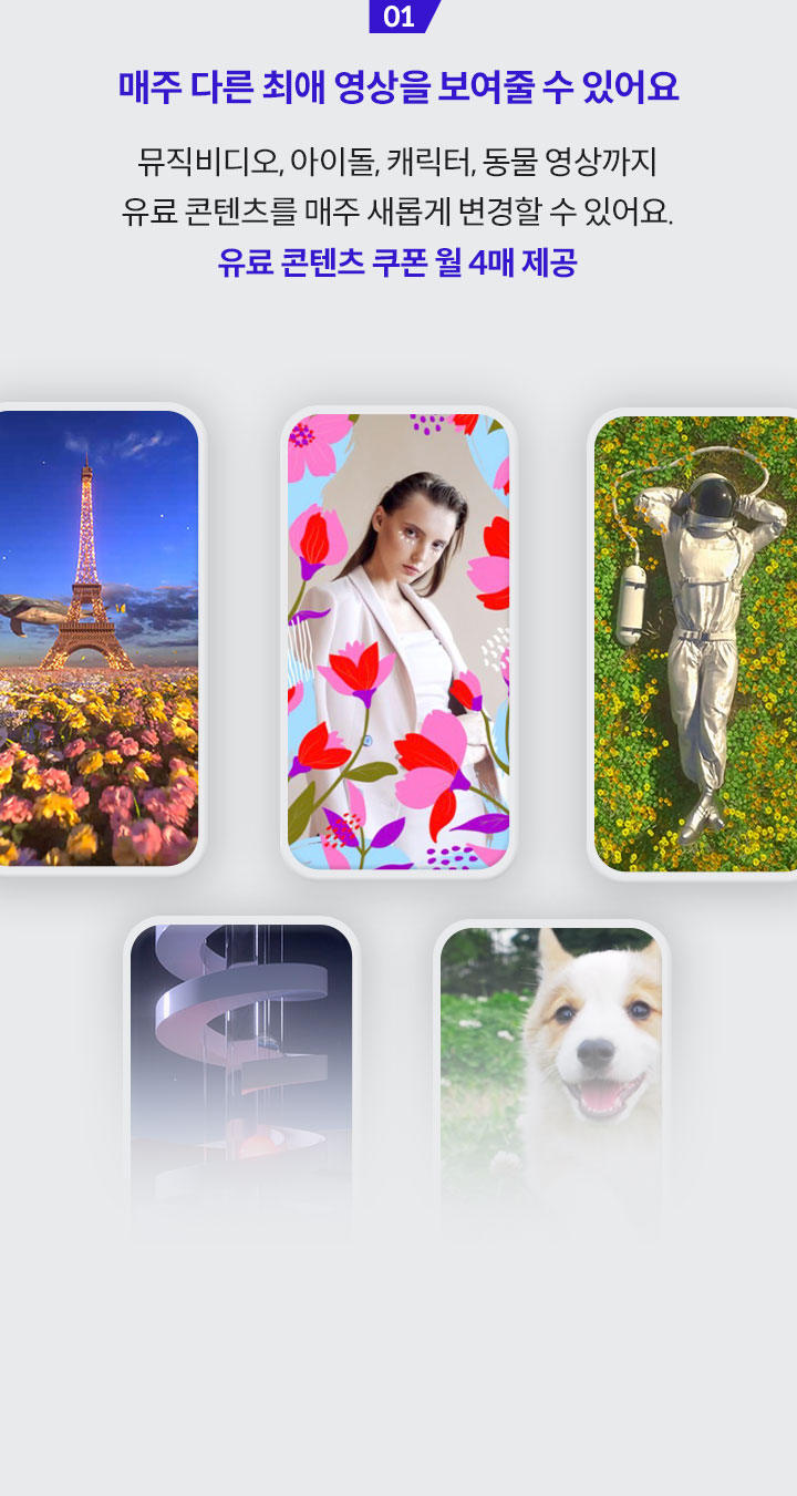 뮤직비디오, 아이돌, 캐릭터, 동물 영상까지 유료 콘텐츠를 매주 새롭게 변경할 수 있어요. 유료 콘텐츠 쿠폰 월 4매 제공
