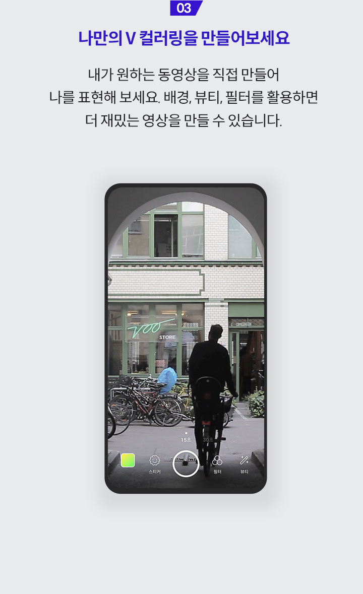 내가 원하는 동영상을 직접 만들어 나를 표현해 보세요. 배경, 뷰티, 필터를 활용하면 더 재밌는 영상을 만들 수 있습니다.