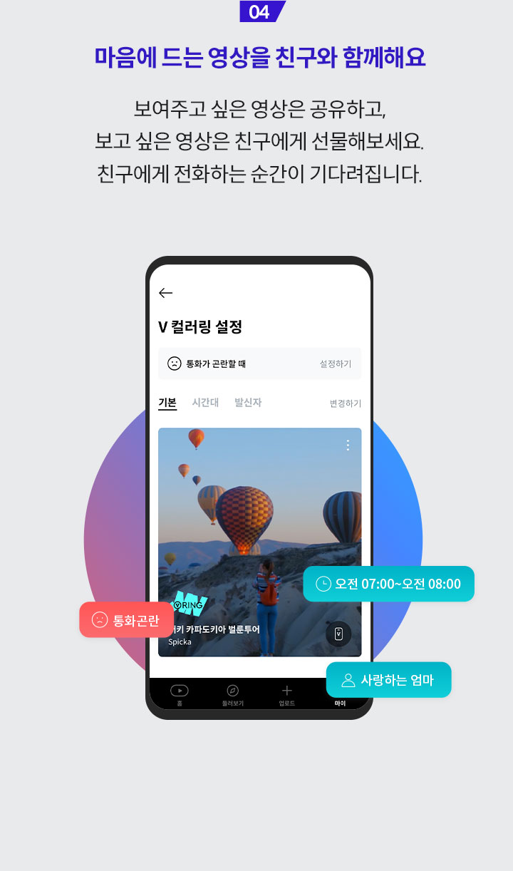 보여주고 싶은 영상은 공유하고, 보고 싶은 영상은 친구에게 선물해보세요. 친구에게 전화하는 순간이 기다려집니다. 나를 표현해 보세요. 배경,뷰티,필터를 활용하면 더 재밌는 영상을 만들 수 있습니다.